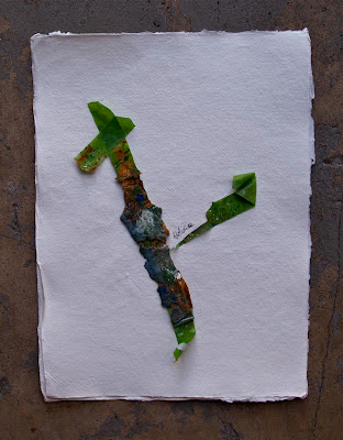 | green tape paintings ochres on green tape on Khadi paper 17" x 12" |